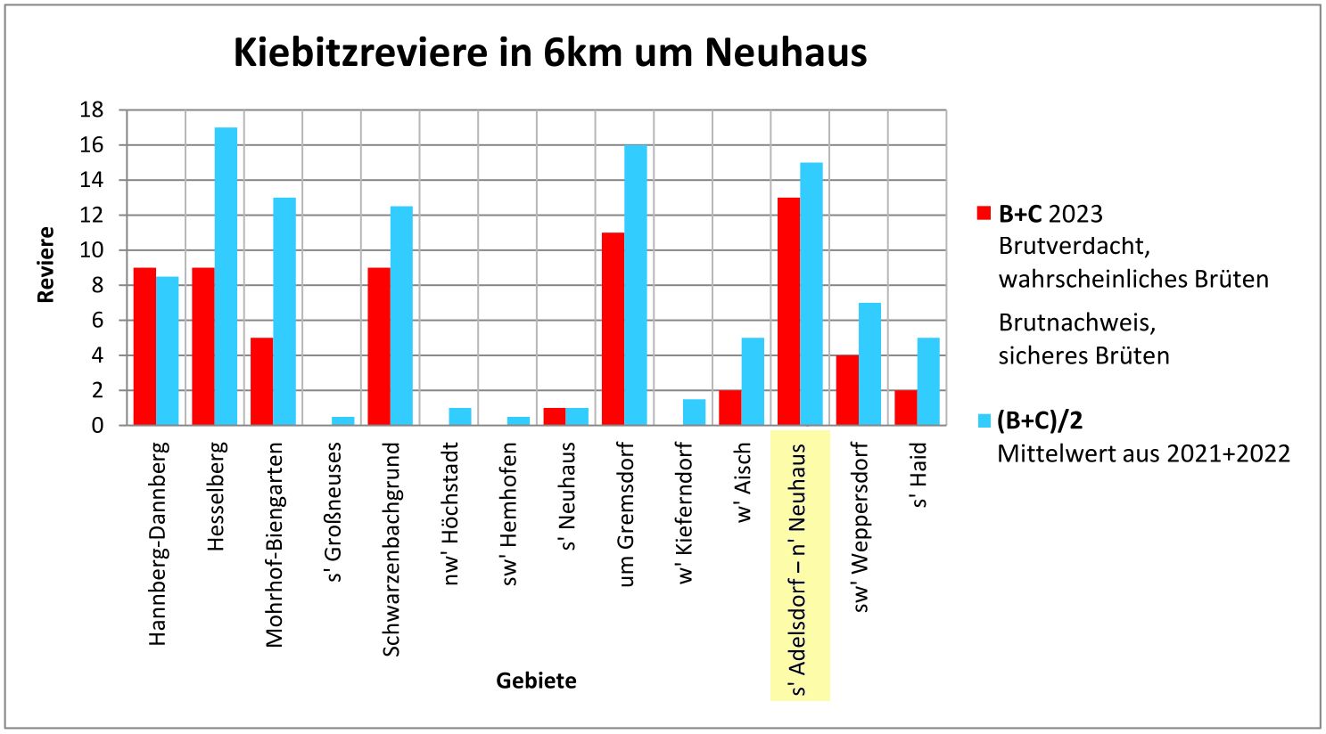 Dazu zählen dann randlich der Schwarzenbachgraben (HÖ), das NSG Mohrhof bis Hannberg, Weppersdorf und fast bis Haid sowie natürlich der Bereich nördlich Neuhaus bis südlich Adelsdorf. Genau in diesem Bereich waren 10% der Kiebitze vom gesamten Landkreis ERH im Jahr 2023 am Brüten. Generell muss noch erwähnt werden, dass alle Revierangaben ein Minimalwert sind, denn viele Vögel werden selbst von Fachleuten bei Sichtprüfungen übersehen. Die Relationen bleiben natürlich erhalten.