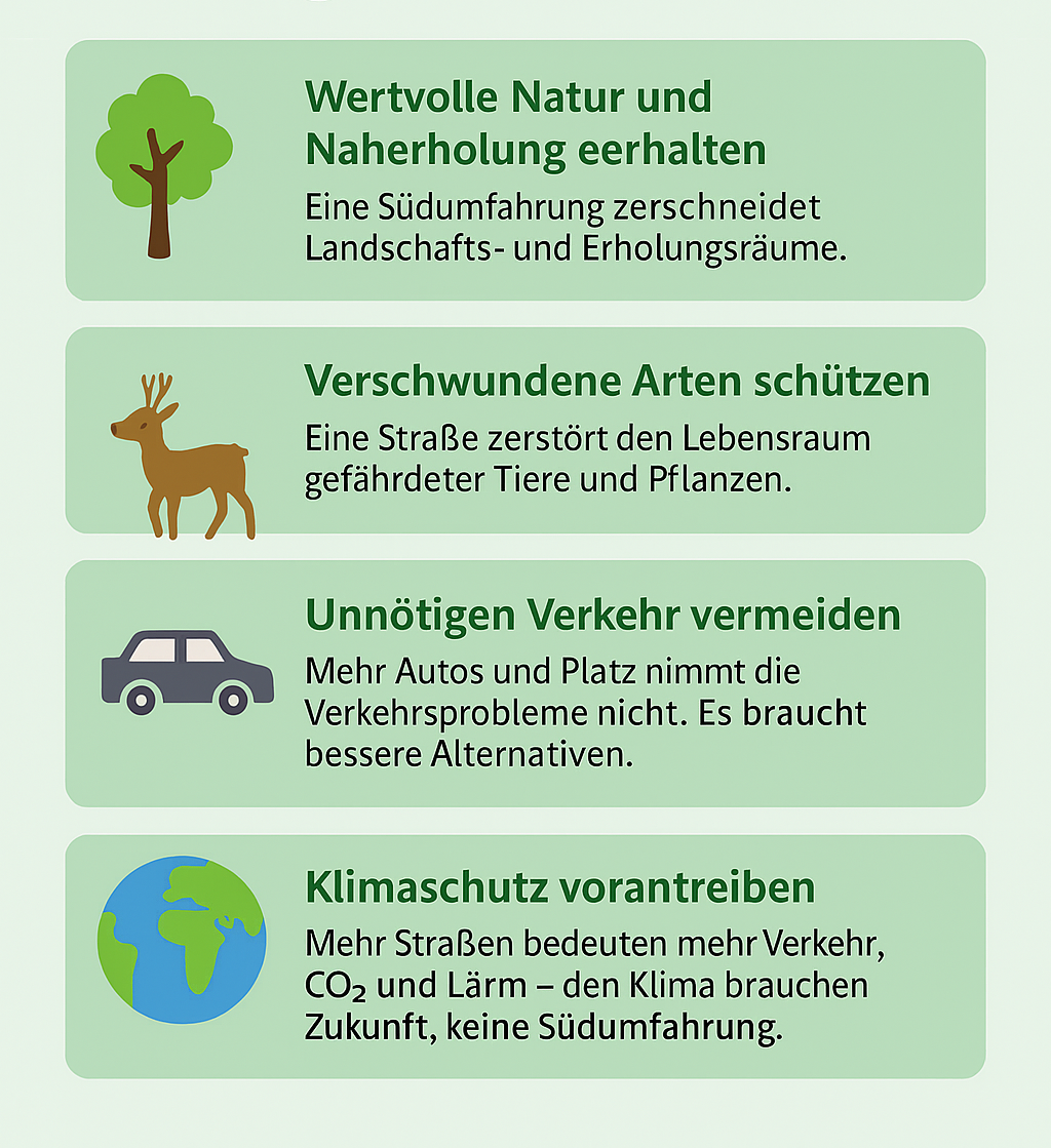 Die Südumfahrung hätte wertvolle Landschafts- und Naherholungsräume zerschnitten, Lebensräume gefährdeter Arten zerstört und zusätzlichen Verkehr sowie Lärm in bislang ruhige Gebiete gebracht. Gemeinsam mit vielen Unterstützer*innen haben wir gezeigt: Eine zukunftsfähige Mobilität braucht keine neuen Straßen, sondern kluge Alternativen – für Mensch, Natur und Klima.