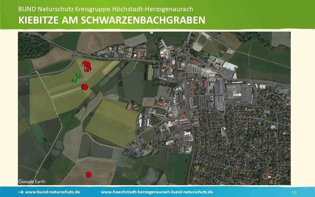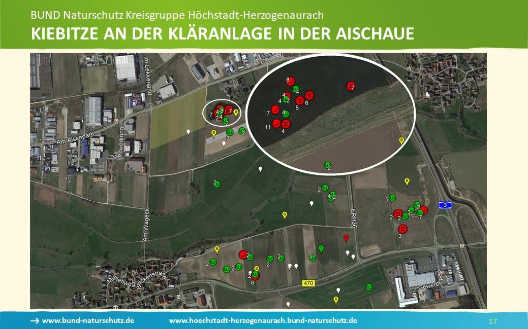 Die Folie soll also zeigen, wo die wichtigen Gebiete sind. Bruterfolge werden durch rote Markierungen angezeigt. Ein Hauptgebiet ist die Aischaue in der Nähe der Kläranlage, aber auch am Schwarzenbachgraben und am Häckersteig. Bei den beiden Letzteren wurden nur die Ergebnisse festgehalten, die von Ornithologen gemeldet wurden, da diese Bereich bisher nicht im Umfang der Hilfe für Kiebitze lag. (Näheres siehe unter HiKi, Gebiete).