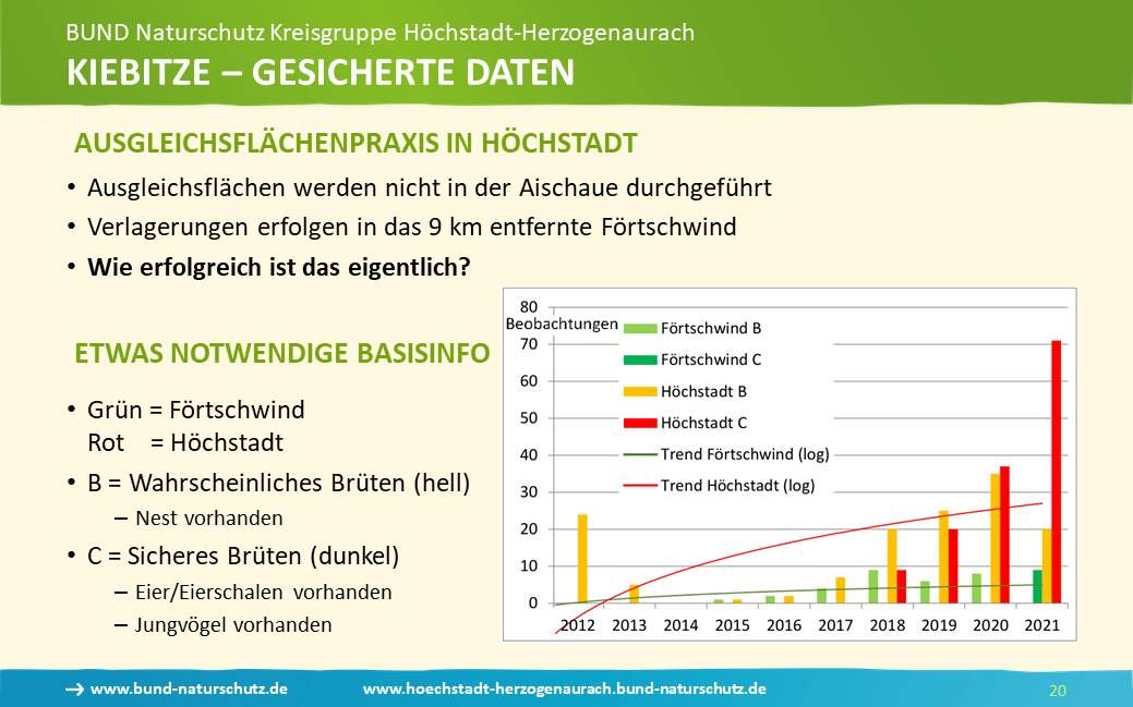 Höchstadt hat ab 2010 für das Gewerbegebiet im Osten Ausgleichsflächen im 9 km entfernten Förtschwind ausgewiesen. Eine nicht ganz einfache Auswertung der Daten aus der Hilfe für Kiebitze ergibt, dass die Zunahme der Bruterfolge in Förtschwind erheblich unter den Bruterfolgen im Aischgrund liegt. Die logarithmischen Trendlinien zeigen dies. Somit ist der Erhalt der Vögel im Aischgrund wesentlich effektiver als der hochgepriesene Ausgleich.
