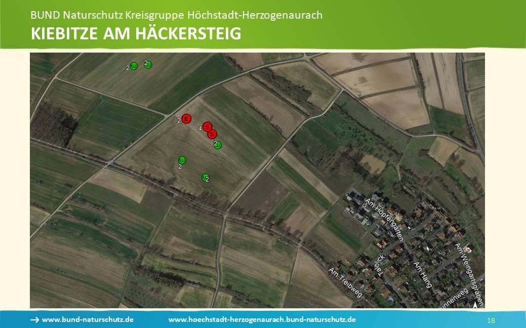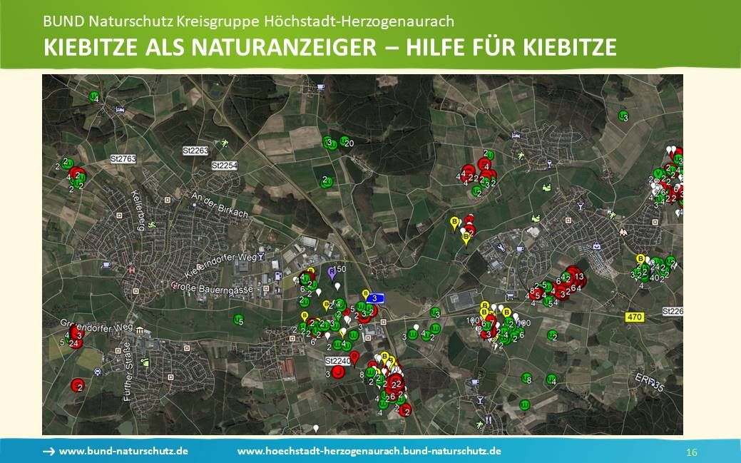 Gemeinsam mit der Unteren Naturschutzbehörde hat die Bund Naturschutz Kreisgruppe vor vier Jahren das Projekt „Hilfe für Kiebitze“ gestartet. Die Ergebnisse sehen Sie auf dieser Folie. Hier sind alle Meldungen der Beobachter der letzten Jahre ausgewiesen, wobei die meistens im zwei bis vier Tage-Abstand gemeldet wurden.