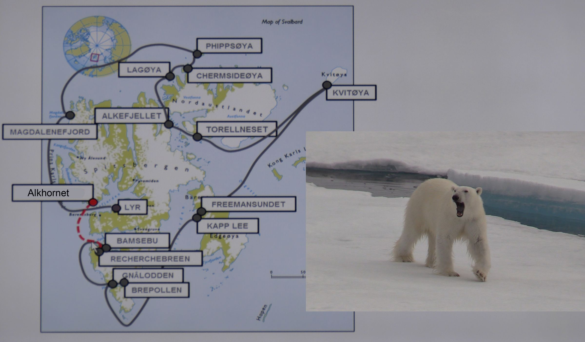 Ein besonderes Erlebnis ist Alkefjellet oder “Lummenberg." Im Sommer besetzen ca. 60.000 Brutpaare der Dickschnabellummen fast jeden Zentimeter des Vogelfelsens. Ebenso beeindruckend ist die Begegnung mit den mächtigen Walrössern , den Rens und dem Polarfuchs. Nochmals Richtung Norden geht es nach Kvitøya. Kvitøya fasziniert nicht nur durch ihre hocharktische Landschaft sondern auch durch seine dramatische Geschichte. Ein besonderes Highlight ist Brepollen eine der eindrucksvollsten Gletscherbuchten in Svalbard. Über den Bellsund, Alkhornet und Skansburka mit einer reichen Flora und Fauna erreichen wir wieder Longebyen.